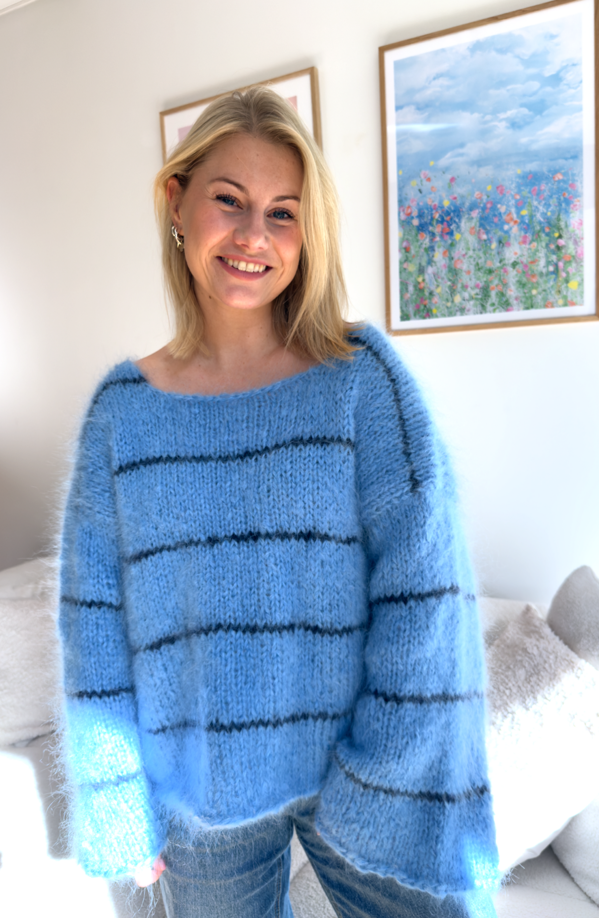 Ønsker du en annen kombinasjon enn det som er, send melding til kundeservice. Genseren er strikket i 707 Isblå med 725 Marine som kontrastråd. Nybegynnergenser strikkes i Soft fra Gjestal