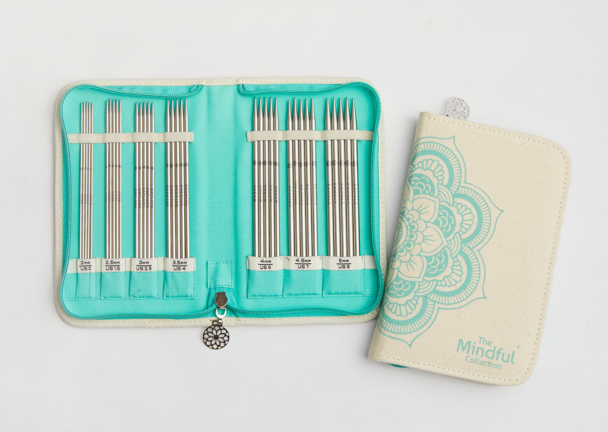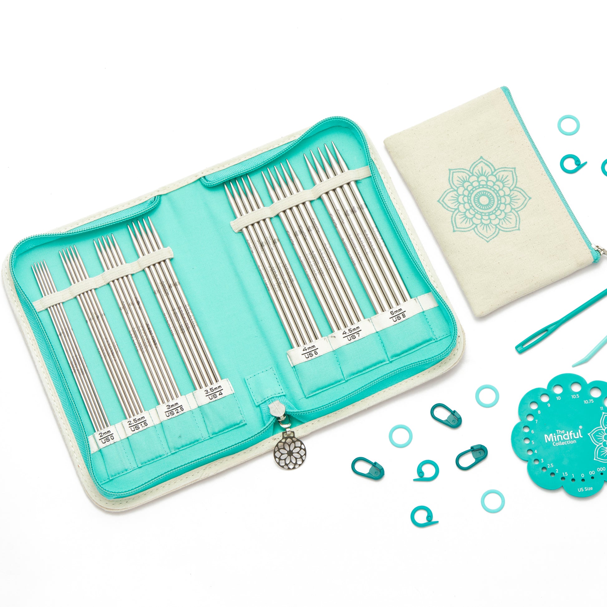 The Grateful Set er en del av The Mindful Collection fra KnitPro. Dette settet har strømpepinner i rustfritt stål som er 15 cm lange. Pinnetykkelser går fra 2,0 - 5,0 mm. Et ord til inspirasjon er lasertrykket på de 5 pinnene i hver størrelse. I et separat etui med glidelås er det ullnåler, en pinnemåler og en flere ulike typer maskemarkører. Alle disse godsakene kommer samlet i et flott stoffetui med symbolet som går igjen på hele The Mindful Collection, og representerer universet, livet og en søken etter helhet.